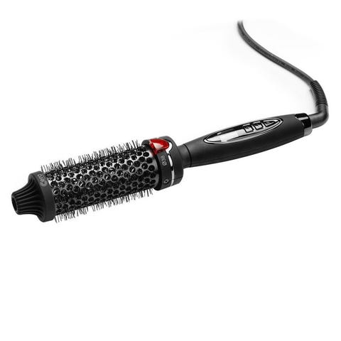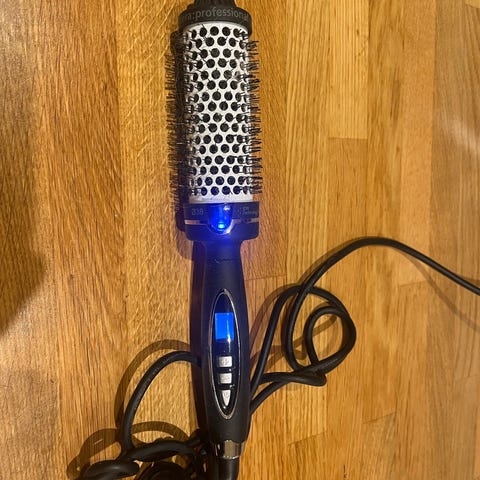 Elektrisk rundbørste med varmefunksjon for styling og forming av hår. Børsten har sylinderformet børstehode med ventilert kropp som fordeler varmen jevnt gjennom håret. Ledning er festet i enden av håndtaket.