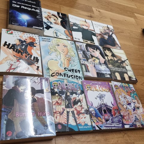 Samling med ulike manga tegneserier i blandede serier og utgaver. Inneholder flere forskjellige titler og bind, med både action, komedie og drama. Bøkene er i lommeformat typisk for manga, med svart-hvitt illustrasjoner og fargerike omslag. Egner seg for lesere som ønsker en variert samling manga på japansk eller engelsk, avhengig av enkeltutgivelsene i samlingen.