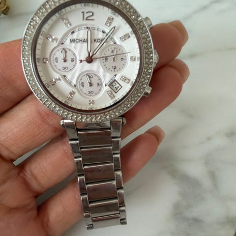 Michael Kors dameklokke i sølvfarget stål. Klokken har rund urskive i lys tone med arabiske tall og flere underskiver for ekstra funksjoner. Lenken er i leddet stål med foldespenne. Leveres i original Michael Kors-eske, og kjøpsbevis følger med etter avtale. Egnet som hverdagsklokke eller til mer formelle anledninger. Er kun brukt noen få ganger.
