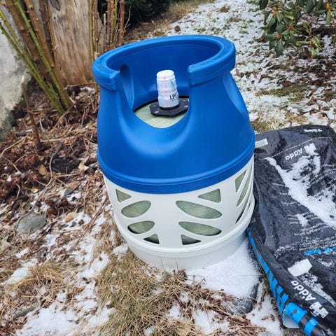 Tom gassflaske 5kg klar for å byttes inn i ny.