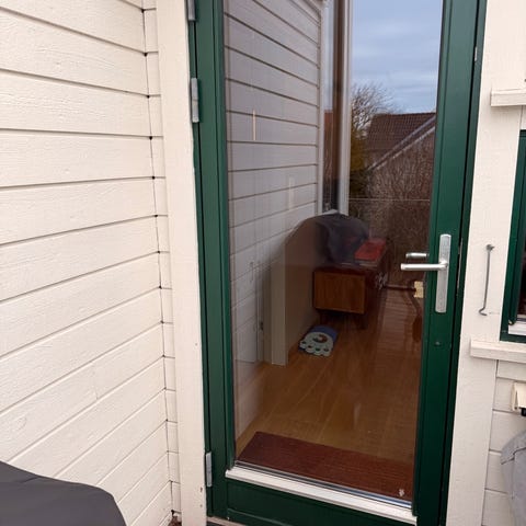 Terrassedør i hvit utførelse med stort glassfelt. Aluminiumsprofiler på yttersiden.
