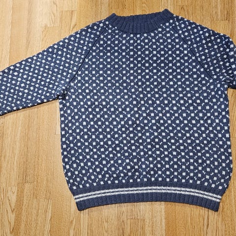 Strikket en islendergenser til min samboer, men den ble for liten for han. Han bruker vanligvis M, innimellom L. Halsen ble også litt lengre enn han foretrekker