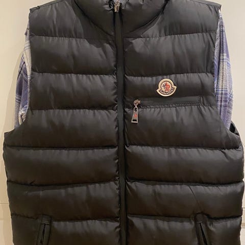 Moncler dunvest for herre i størrelse M. Vesten er svart og vattert med dun, med glidelås i front. Den har sidelommer med glidelås og brystlomme med klaff og Moncler-logo. Egnet som ytterlag eller mellomlag i kjøligere vær.