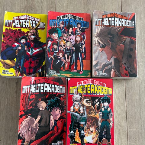 Bildene viser to norske utgaver av mangaserien Mitt helteakademia (My Hero Academia) av Kohei Horikoshi, utgitt av Outland Forlag. Hver bok er en omnibusutgave som samler flere bind av den populære serien.