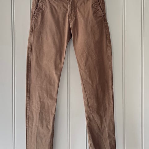 Hugo Boss chinos for herre i størrelse 52. Buksen er laget i brun cordfløyel og har klassisk chinos-snitt med beltehemper, glidelås og knapp i livet. Foran er det skrålommer, og bak er det lommer med klaff og knapp. Passer som en hverdagsbukse eller til mer pyntede anledninger der man ønsker en bukse i myk cordfløyel.