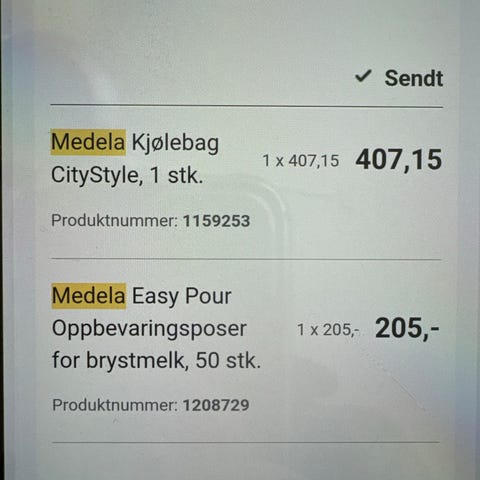 Medela kjølebag med flasker og kjøleelementer. Settet består av en isolert kjølebag, flere tåteflasker med skrukork og gule lokk, samt formtilpassede kjøleelementer. Kjølebagen er beregnet for oppbevaring og transport av utpumpet morsmelk. Flaskene kan brukes til både oppbevaring og mating. Kjøleelementene legges i fryser før bruk for å holde innholdet i flaskene kaldt over lengre tid. Passer for bruk hjemme, i barnehage eller på reise der det er behov for å frakte og lagre morsmelk på en trygg måte.