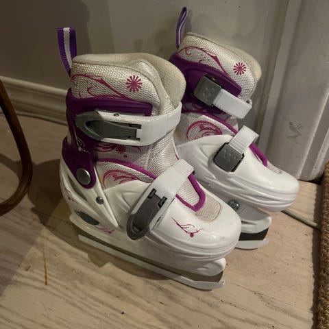 Justerbare skøyter for barn i hvit og lilla farge. Skøytene har plastskall med spenner for enkel justering og tilpasning. På siden er det markert størrelser fra 34 til 37, noe som tyder på at skøytene kan justeres innenfor dette størrelsesområdet. Egner seg til bruk på isbaner og skøytebaner til fritidsbruk for barn.