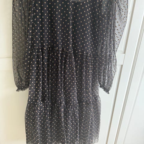 H&M hverdagskjole i størrelse M. Kjolen er kremhvit med prikkete mønster og laget i polyester. Modellen har lagdelt skjørt og transparente ermer med samme prikkemønster. Passer som hverdagskjole eller til enkle anledninger.