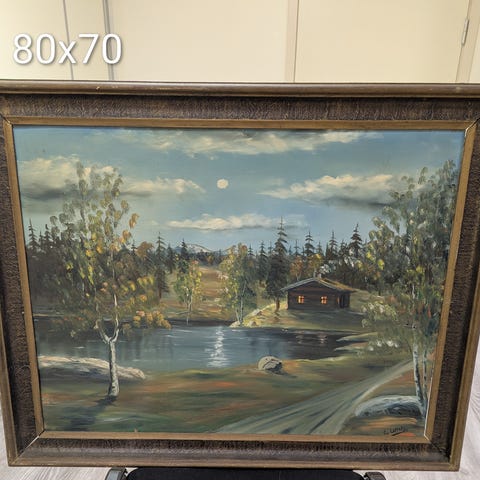 Brodert bilde med landskapsmotiv i ramme. Motivet viser skog, fjell og en hytte med solnedgangshimmel i bakgrunnen. Bildet er montert i en enkel treramme og har opphengssnor på baksiden. Egner seg som veggdekor i stue, gang eller hytte.