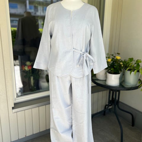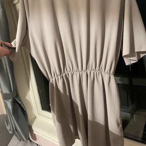 Boohoo jumpsuit for dame i størrelse EUR 40, liten i str passer S/M. Jumpsuiten er gråbeige og er laget i polyester. Modellen har korte ermer, rund hals og knytebelte i livet som kan justeres. Buksen har vide ben og åpning i ryggen med knappelukking øverst. Passer til bruk både til hverdags og mer pyntede anledninger, avhengig av tilbehør.