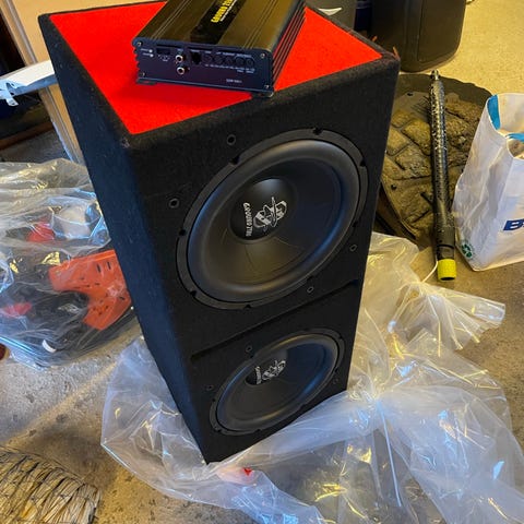Ground Zero subwoofer med kasse og tilhørende forsterker.