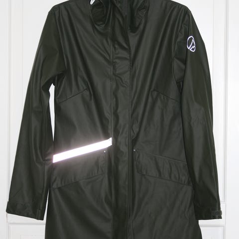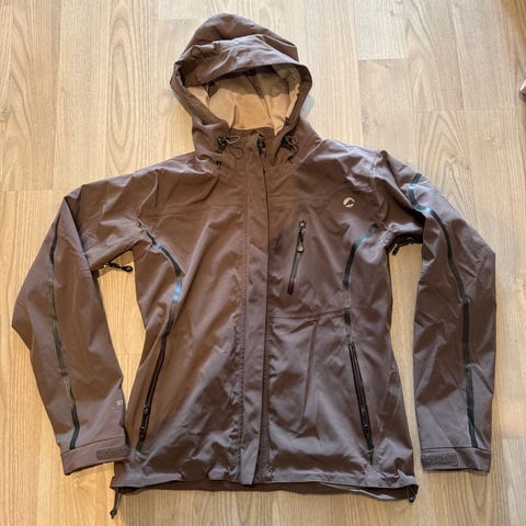 Stormberg regnjakke for dame i størrelse XS. Jakken er hvit med mørke kontraststriper på ermene og har hette med kontrastfarge på innsiden. Den er laget i polyester og egnet som regntøy til hverdagsbruk og tur. Jakken har frontlommer med klaff, justering nederst og snøring i livet for bedre passform. Det er synlige bruksspor og flekker nederst på ermene, slik bildene viser.