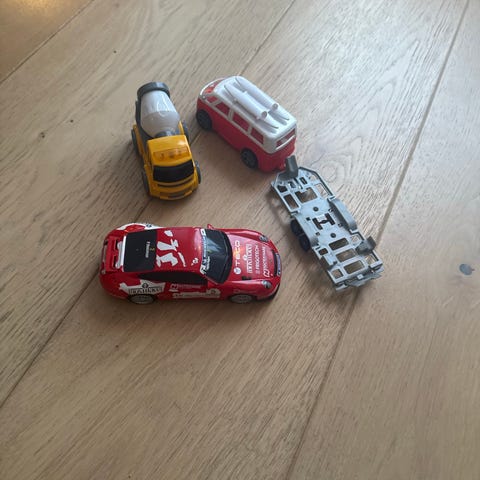 Samling med ulike lekebiler med- og uten batteri. Super Mario mangler deksel til batteri.