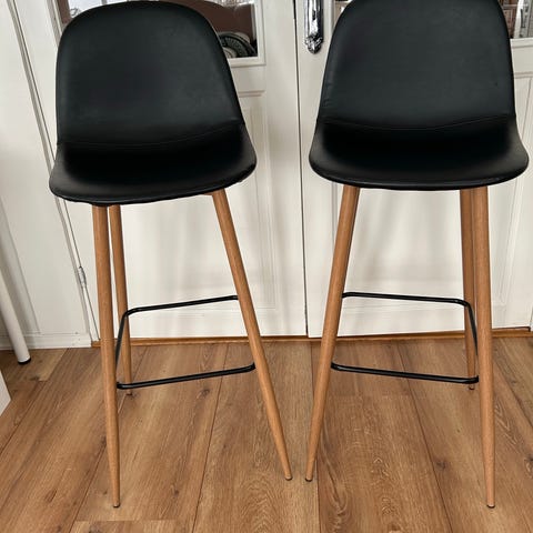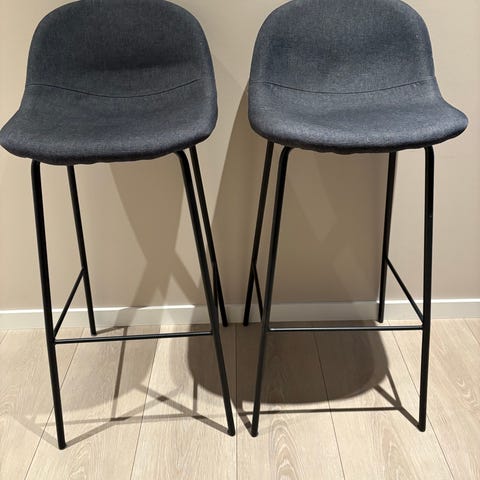 To barstoler i sort velur. Kjøpt hos Skeidar. Behagelig å sitte på i lengden. Både høye og lave har vært fornøyd med komforten. Vært veldig fornøyd med disse, men har flyttet og finner ikke plass til de. Sittehøyde på 65 cm. 42 cm fra sete til fotstøtte.