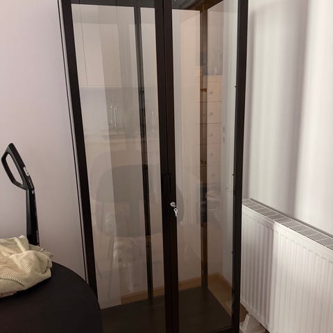 Vitrineskap fra Ikea i glass og metall, med hyller i glass og låsbar dør. Mye oppbevaring i et skap som ikke tar stor plass. Dekorativt og stilrent. Spotter er installert og medfølger sammen med kontroll.