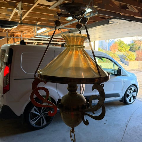 Taklampe parafinlampe med hvit glasskjerm og messingdetaljer