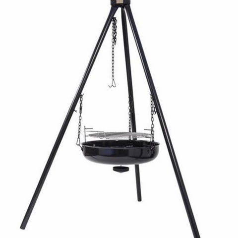 Espegard bålpanne stativ med grillrist i svart metall. Stativet er utformet som et tripoddstativ med tre bein og kjettingoppheng for bålpannen. Grillristen kan justeres i høyden over bålet. Egnet til matlaging og oppvarming utendørs, for eksempel i hage, på terrasse eller hytteområde. Laget for bruk med ved eller kull i bålpannen under risten. Sendes ikke, må hentes.
