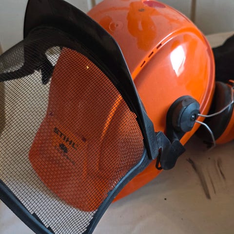 Motorsag chaps-verne bukse fra Oregon, brukt en gang, og hjelm med klokker og visir selges for 1200kr. Buksa er str 52.