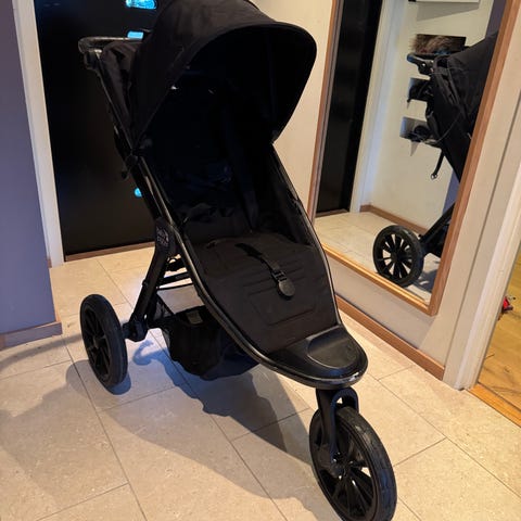 Baby Jogger joggevogn i svart. Vognen har tre hjul med større bakhjul og svingbart forhjul, samt varekurv under setet. Setet har justerbar rygg og fempunktssele. Vognen har fotbrett foran og stor kalesje som gir skjerming. Egnet for én sittende passasjer. Farge: svart.