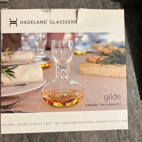 Hadeland Glassverk Gilde drammekarafler med tilhørende glass.