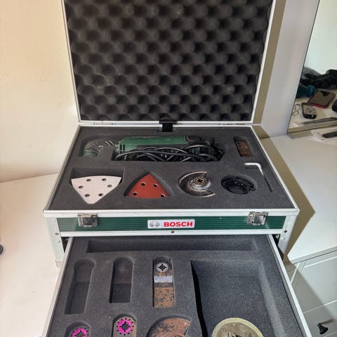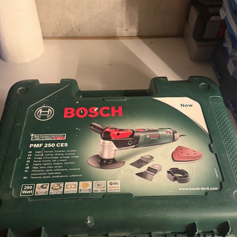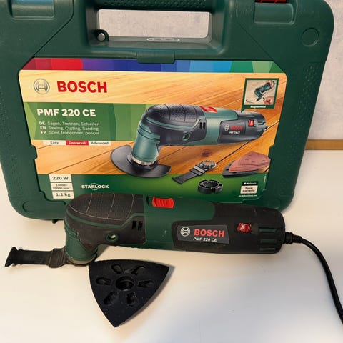 Godt brukt - Bosch PMF 180 E multiverktøy med koffert. Elektrisk multiverktøy egnet til diverse oppgaver som saging, sliping og skraping. Leveres i plastkoffert med ulike tilbehør som slipeplate, slipepapir og blader. Drevet med ledning og standard støpsel for vanlig stikkontakt. Kan sendes.