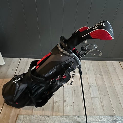 Settet inkluderer golfbag med skulderreim og støttebein. Det er 6 jern med.
