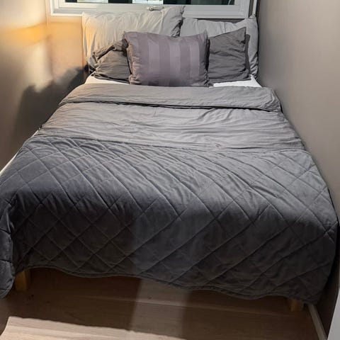Pent brukt rammemadrass gis bort. Uten flekker på overmadrass og ramme. Litt slitt i et hjørne av rammemadrassen og ben har slitasje under.