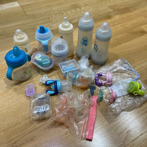 Selger baby flasker og oppbevaringskopper.