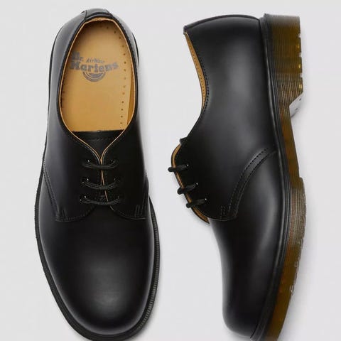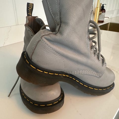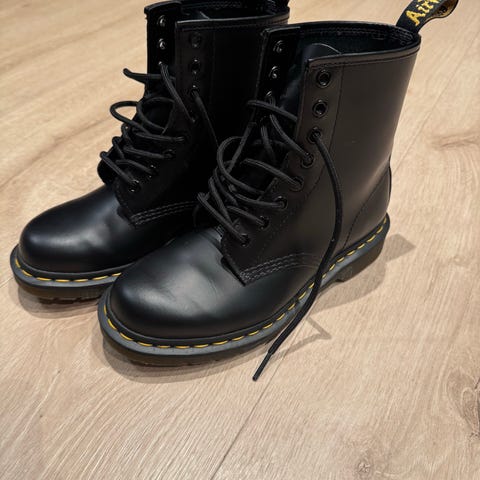 Svart, glatt skinn med klassiske gule sømmer og hempe bak på skaftet. Snøremodell med høyt skaft og kraftig, mønstret gummisåle. .