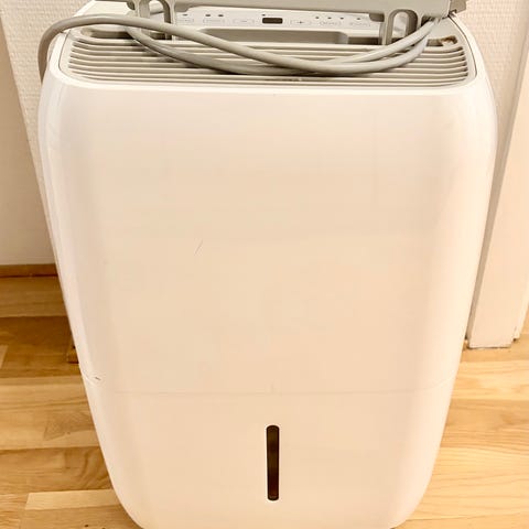 luftavfukter i hvit utførelse. Enheten har toppmontert betjeningspanel med digitale knapper og display, samt luftutslipp på toppen. På baksiden sitter luftinntak med gitter og avtakbar vannbeholder nederst, med nivåindikator i front. Egnet for innendørs bruk til å redusere luftfuktighet i rom som kjeller, vaskerom eller andre fuktige områder. Strømkabel følger fastmontert på apparatet.
