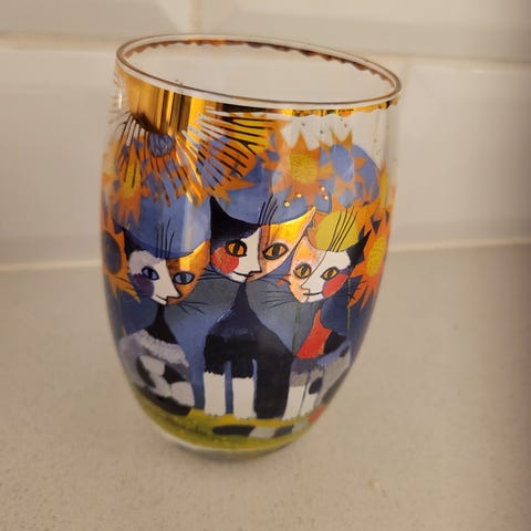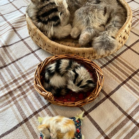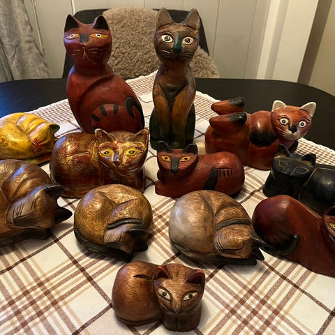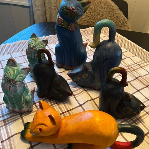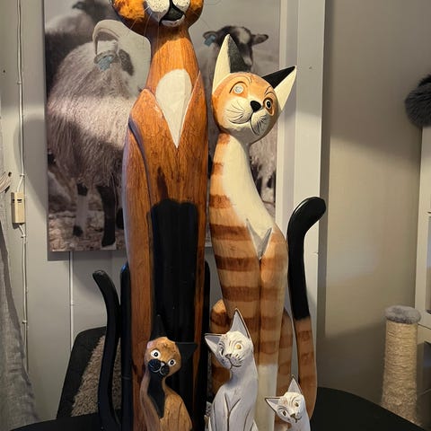 Mål: 2 like katter m. metall er 30 cm høye. De to små stående er 12 og 15 cm. Buet katt er 15 cm.