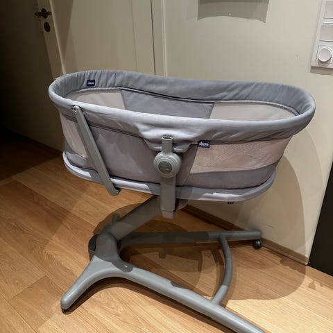 Chicco vugge i grå tekstil med justerbart stativ. Vuggen står på et stabilt understell med hjul for enkel forflytning. Liggedelen har mykt, polstret innvendig stoff og madrass. Høyden kan justeres, og vuggen kan settes både i liggende og mer oppreist posisjon etter behov. Egnet som soveplass for spedbarn i hjemmet.