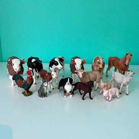 Schleich hestefigurer lekedyr sett. Inneholder flere hestefigurer i ulike farger og størrelser, samt slitent tilbehør som stallbygg og etpar fôrballer. Figurene er detaljerte og laget som lekedyr til barn, egnet til rollelek med gårds- og hestetema. Kan kombineres med andre Schleich-figurer og -sett for utvidet lekemiljø.
