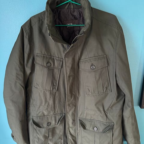 Jack & Jones jakke for herre i størrelse M i bomull med beskyttelsesbelegg. Foret. Jakken er grønn. Modellen har flere frontlommer med klaff og knapp, samt lomme på ermet. Den har hette og full glidelåslukking med knappestolpe foran. Passer som hverdagsjakke og til bruk i overgangssesonger. Kan leveres mellom Hovin og Trondheim.