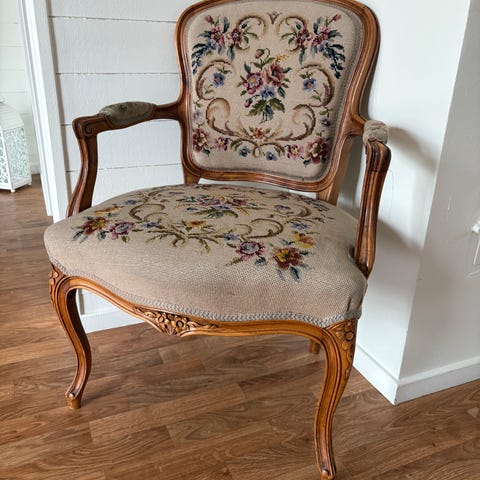 Stolene trenger litt kjærlighet og omtanke. Stoffet er endel slitt noen steder (se bilder) og det mangler et bånd på den ene stolen, men stolene er fine i seg selv.