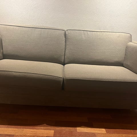 IKEA sofa 2-seter i beige stoff. Kompakt modell som passer godt i mindre stuer, soverom eller hybler. Sofaen har rette armlener og fast rygg, med en løs ryggpute i matchende stoff. Trekket fremstår som et nøytralt, lyst beige tekstil som er lett å kombinere med annet interiør. Designet er enkelt og funksjonelt, med plass til to personer til vanlig sittebruk.