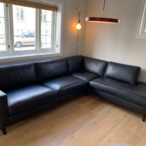 Superfin eco skinn hjørnesofa med stol . Kjøpt på Home and cottage . Noe falmet på baksiden pga av sol men har ingen betydning når den står inntil vegg . Fargen brun sort . Lett å vaske av den . Ny pris 25000kr