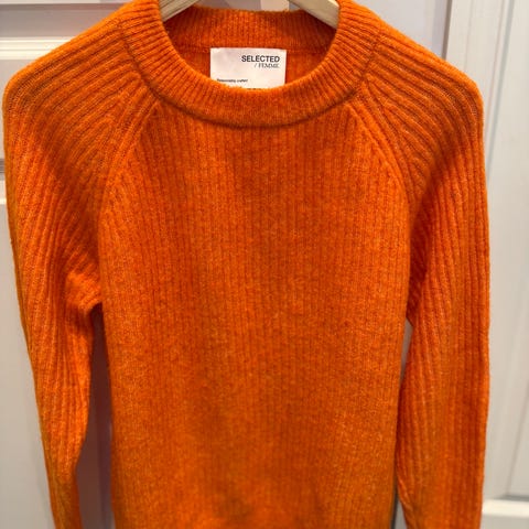 Pent brukt Acne Studios strikkegenser for dame i størrelse M. Genseren er gul og strikket i en grov, strukturert mønsterstrikk. Materialet er 70 % akryl og 30 % ull. Rund hals og ribbestrikkede kanter nederst og på ermene.
