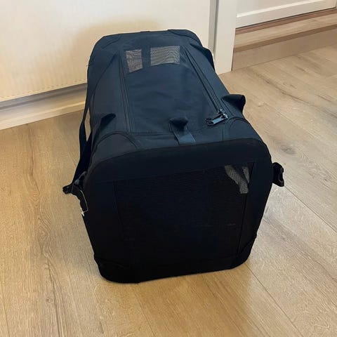 Pent brukt reisebur i stoff, med rørramme som stiver av buret.