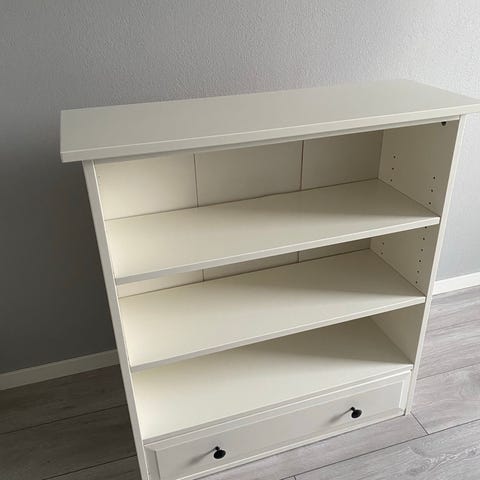 IKEA oppbevaringshylle på hjul i hvit utførelse. Hyllen har to åpne rom øverst, en åpen hylle i midten og en skuff nederst med håndtak. Møbelet står på hjul, noe som gjør det lett å flytte. Egner seg som liten reol eller oppbevaringsmøbel i stue, barnerom, kontor eller soverom. Må selges fort på grunn av flyt