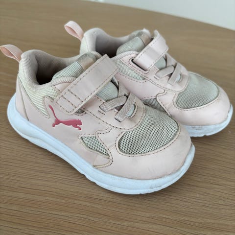 Puma joggesko for jente i størrelse 25. Skoene har overdel i tekstil og syntetisk materiale i lys rosa farge med lysere mesh-felt for bedre pusteevne. Lukking med borrelås og elastiske lisser for enkel av- og påkledning.