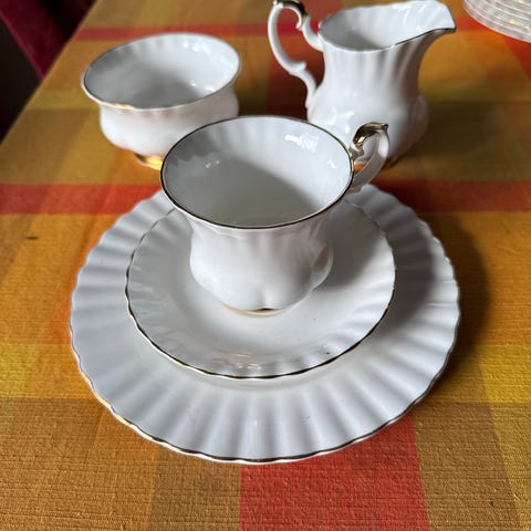 11 frokost tallerkener, 5 kopper, 7 underskåler, 1 sukker skål og 1 stor tallerken/ serveringsfat. 2 av frokost tallerknene har hvert sitt lille skår, svært lite synlig. Sukker skålen har også to små skår som du ser på siste bildet. Ellers ingen synlige bruksmerker.