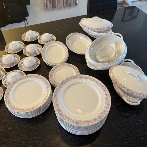 Se bilder for tilstand. Gullkant på asjettene er ganske slitt, bedre stand på de andre produktene.