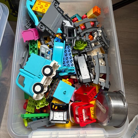 LEGO DUPLO tog og kjøretøy sett. Inneholder ulike togdeler, skinner og tilbehør, samt flere kjøretøy som lokomotiv og bil. Delene er store og tilpasset små barn, med avrundede kanter og robuste plastklosser som kan kombineres med andre LEGO DUPLO-sett. Egner seg til bygging av enkle togbaneoppsett og lek med kjøretøy og figurer for de minste barna.
