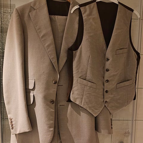 Elegant todelt herredress i lett og luftig stoff. Laget i en eksklusiv blanding av 55 % ramie og 45 % viskose, som gir et svalt uttrykk med fint fall og struktur. Perfekt som sommerdress, dressen er ifra tidlig 80 tallet.