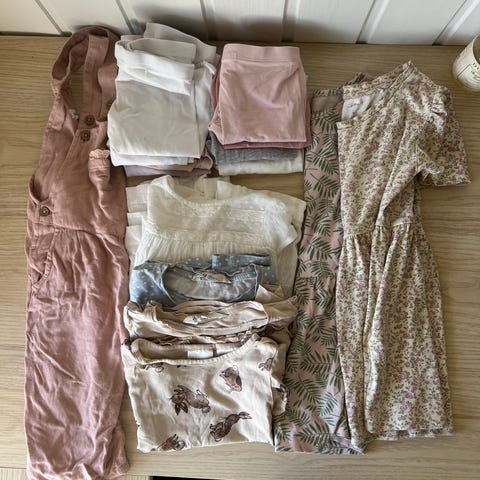 Stor klespakke til jente str.98, 98/104 og 104. Totalt 74 plagg. Er med en del sokker også.