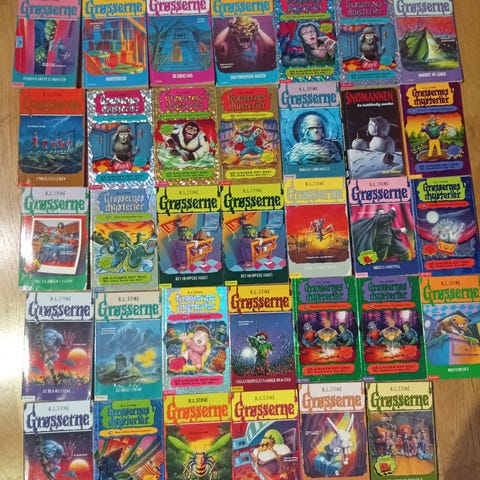 Bokpakke med barnebøker av R.L. Stine fra seriene Goosebumps og Grøsserne. Bøkene er i lommebokformat/pocket og på både norsk og engelsk.