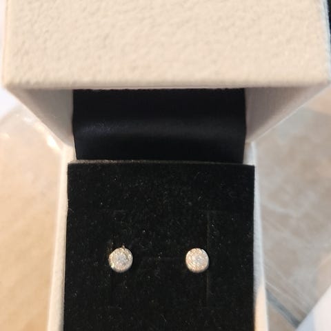 2 x 0,05 ct solitaireorepynt i 14 karat hvitt gull med diamant. Kun prøvd på. Selges for 4000 kr inkl frakt