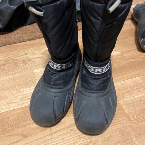 Sorel vinterstøvler for barn, unisex, i størrelse 29. Støvlene er svarte med grov såle og varm, myk innerside som dekker godt oppover ankelen. Overdelen har borrelåsrem for enkel justering og bedre passform. Egnet som varme og robuste vintersko til bruk i kaldt og vått vær. Kan hentes på Haslum i Bærum.