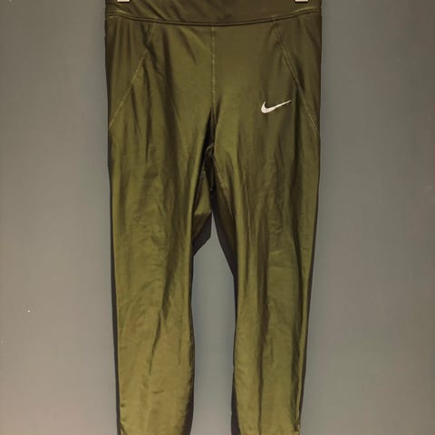 Nike Dri-FIT løpetights for dame i størrelse S. Tightsen er grønn og laget i et teknisk materiale med fukttransporterende Dri-FIT-teknologi som bidrar til å holde deg tørr under løping og annen trening. Modellen har ettersittende passform og elastisk liv for god bevegelsesfrihet.